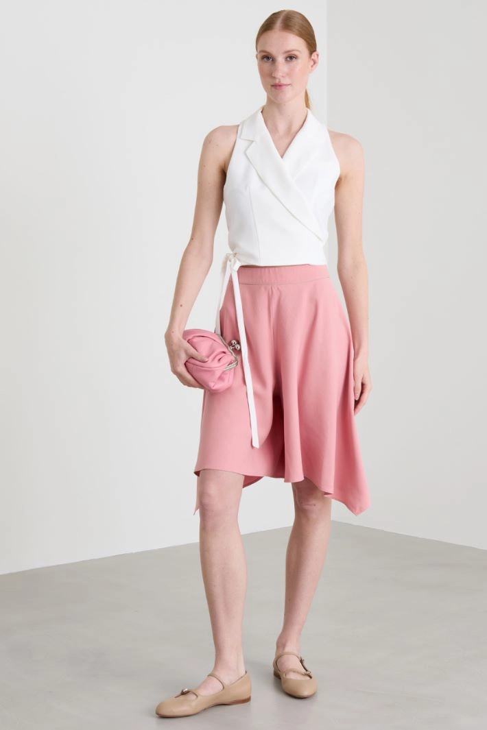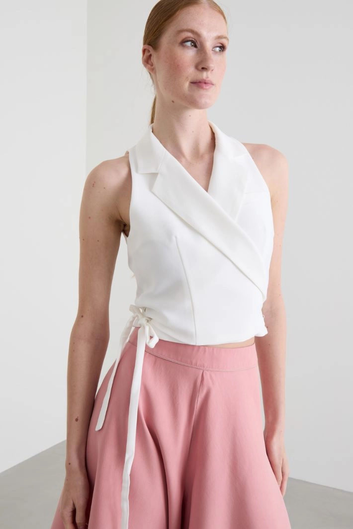 Semi-fitted gilet in stretch woven fabric, with lapel collar and chest welt pocket. Cross-over fastening with bow. Lined.
