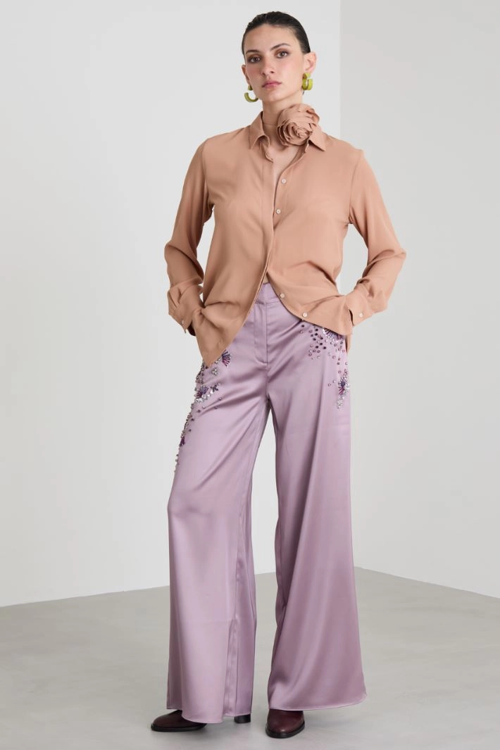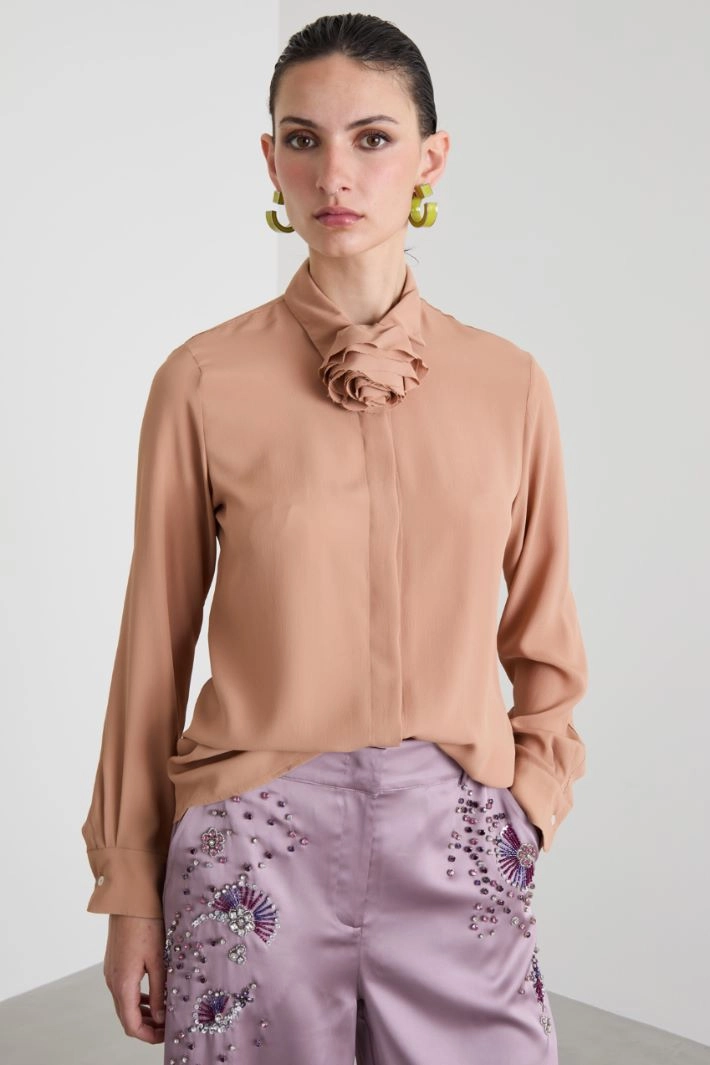 Straight-cut shirt in silk blend crepe, with flower detail, classic collar, long sleeves with buttoned cuff. Concealed button fastening.