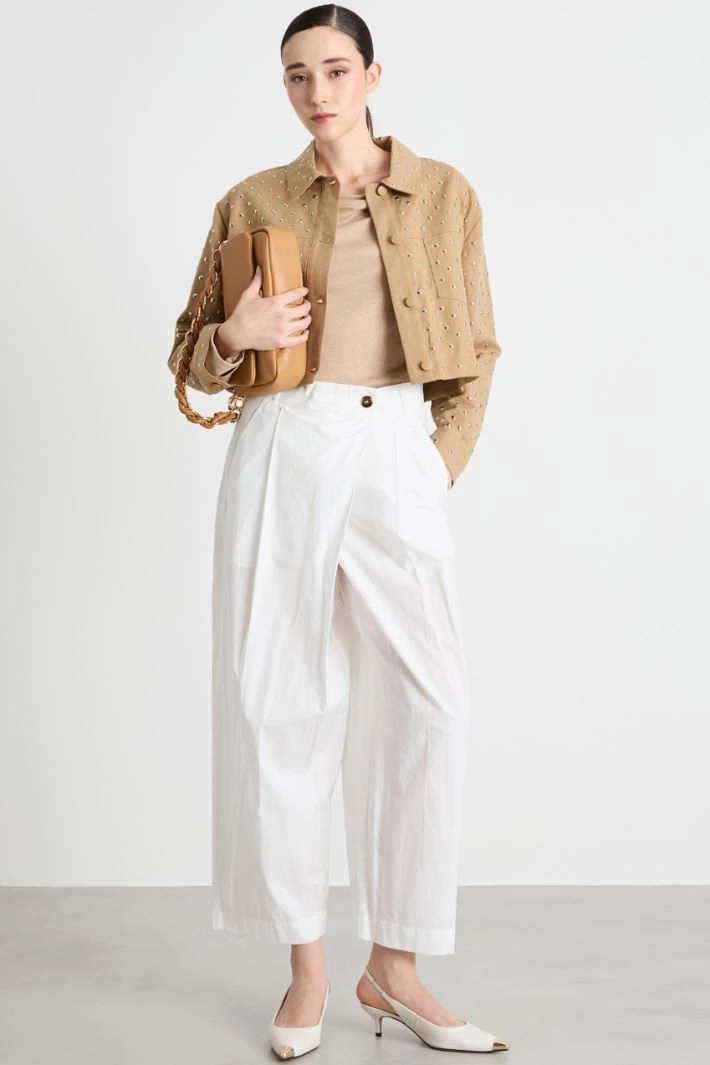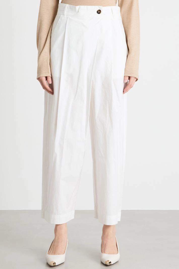 Carrot-fit trousers in pure cotton poplin, featuring pleats, a diagonal overlapping panel on the front, French pockets and patch pockets on the back. Button fastening.