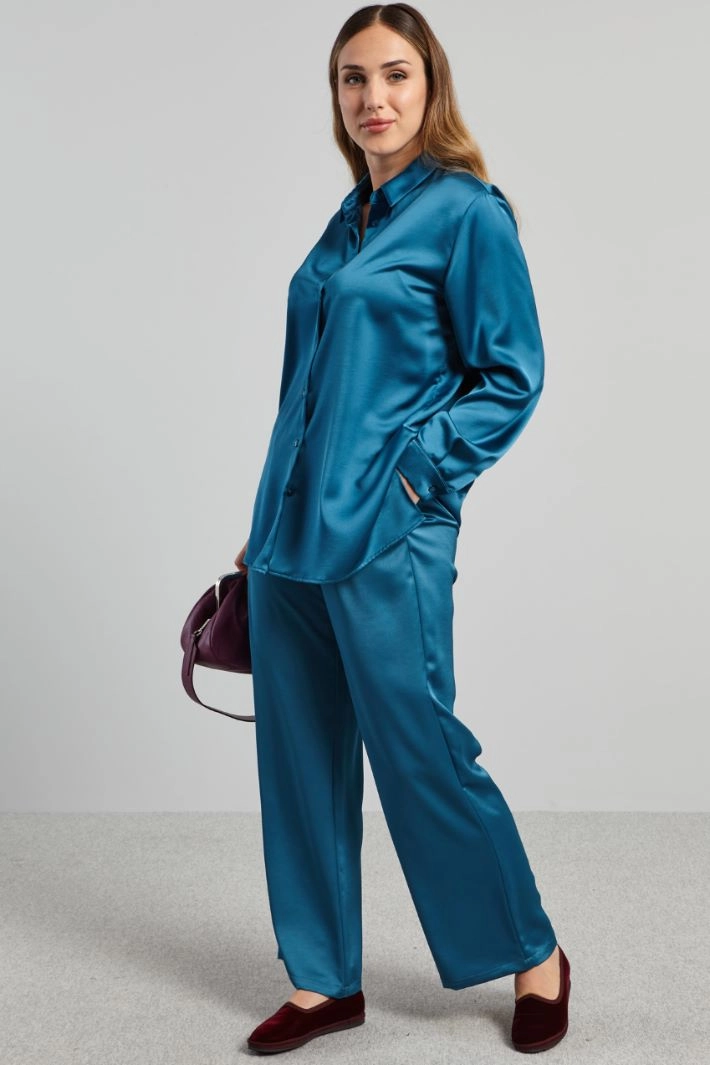 Straight, loose-fit satin trousers with elastic insert at the waist and inset side pockets.