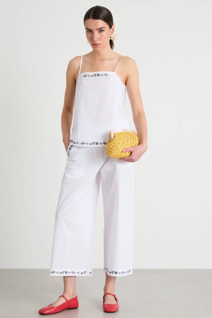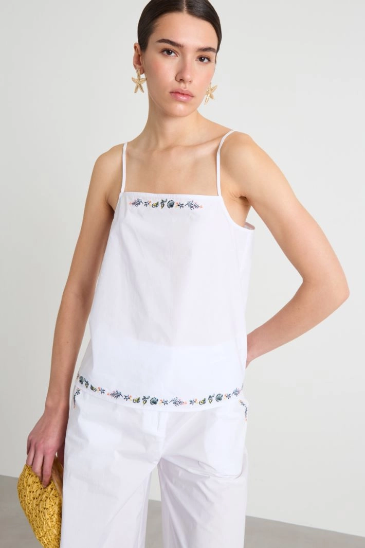 Loose-fit top in pure cotton poplin, embellished with embroidery, with a straight neckline and delicate spaghetti straps.