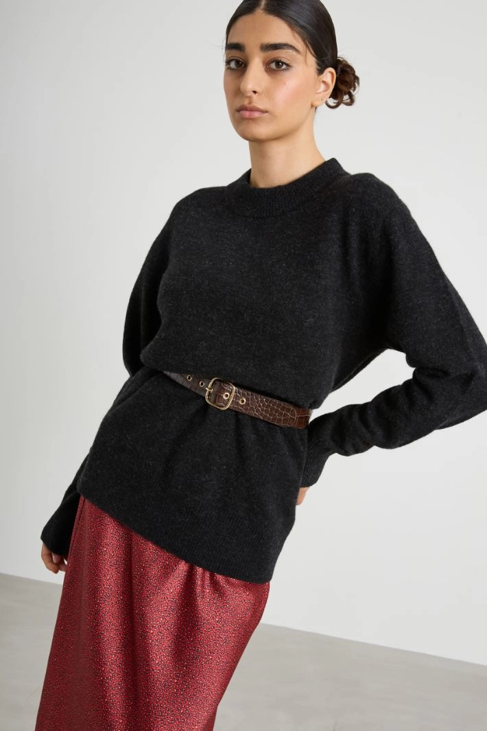 Straight-cut sweater in wool blend yarn, with crew neck and long ribbed sleeves. Detail with opening and buttons on the center back.