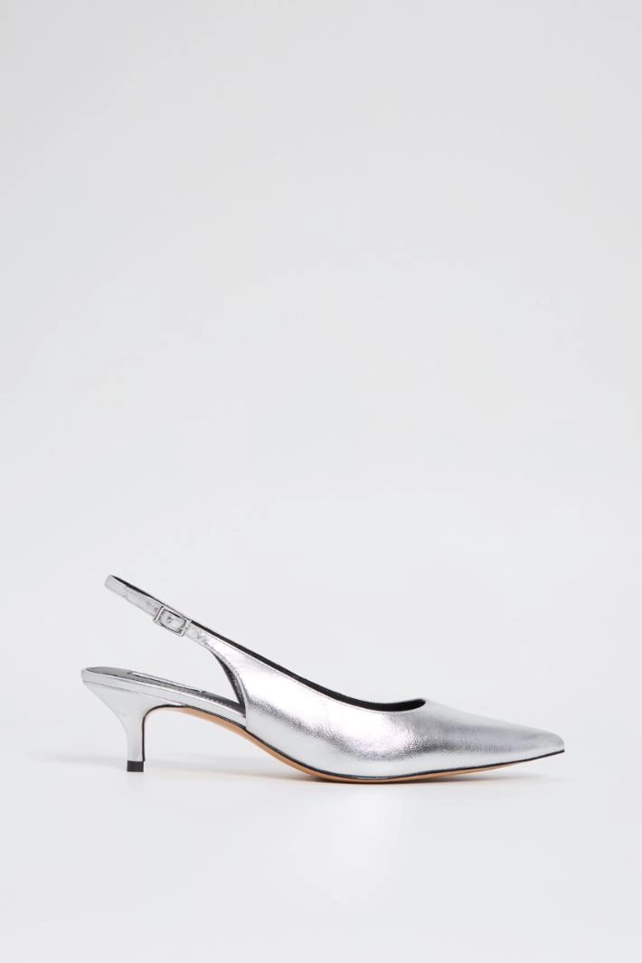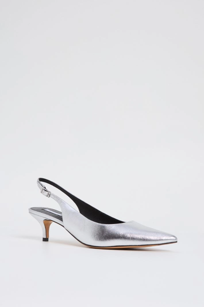 Slingbacks in coated faux leather with a laminated finish, with a pointed toe, a spool heel and an adjustable ankle strap. Leather lining, leather sole.