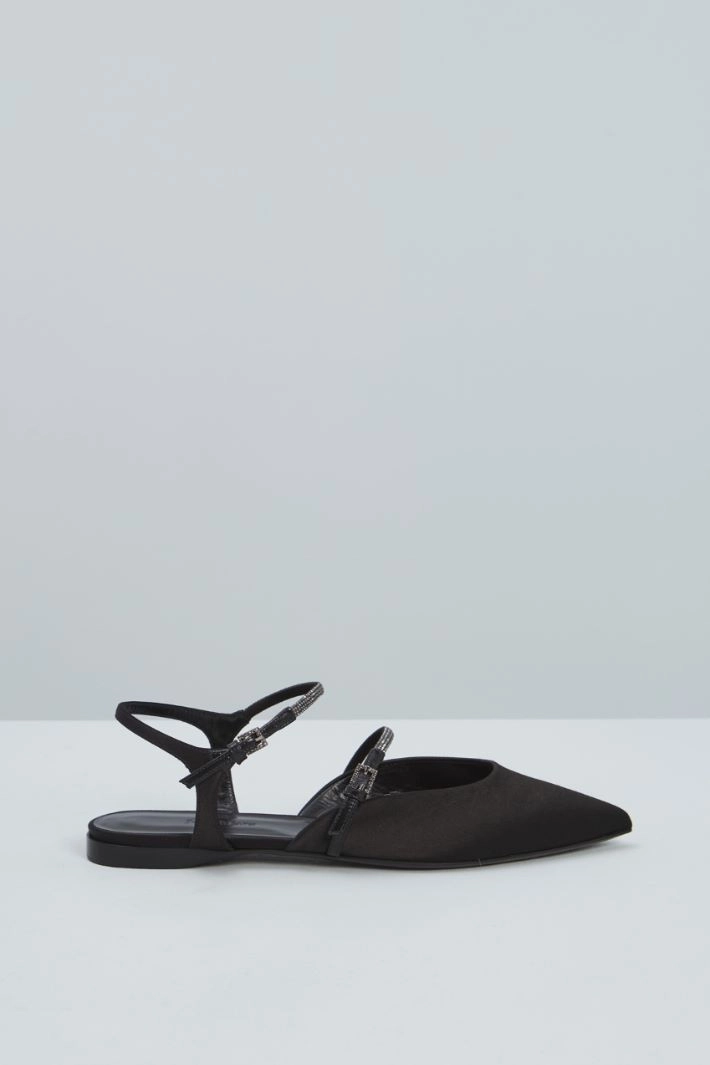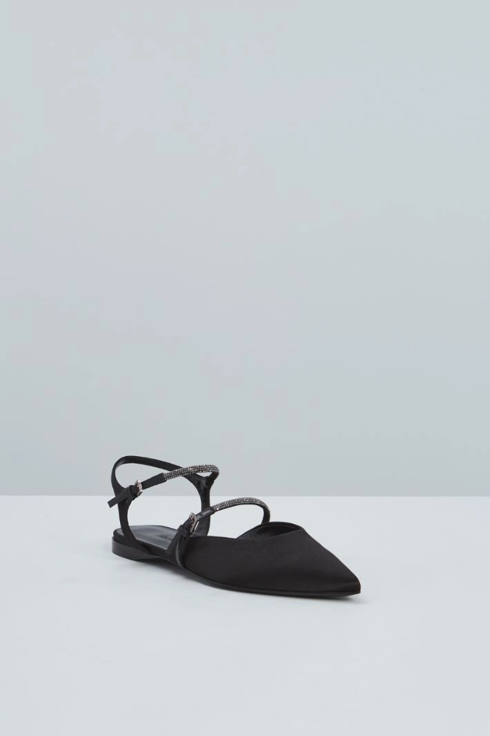 Satin ballerinas with tapered toe and straps finished with rhinestones. Leather lining, buckle fastening. Leather sole.