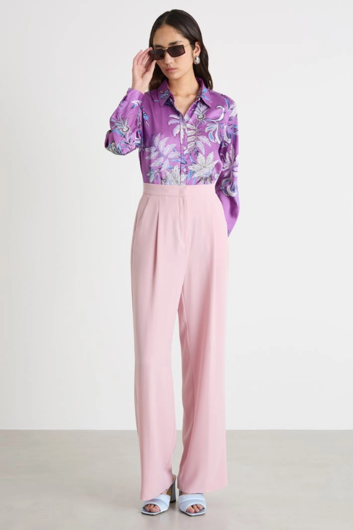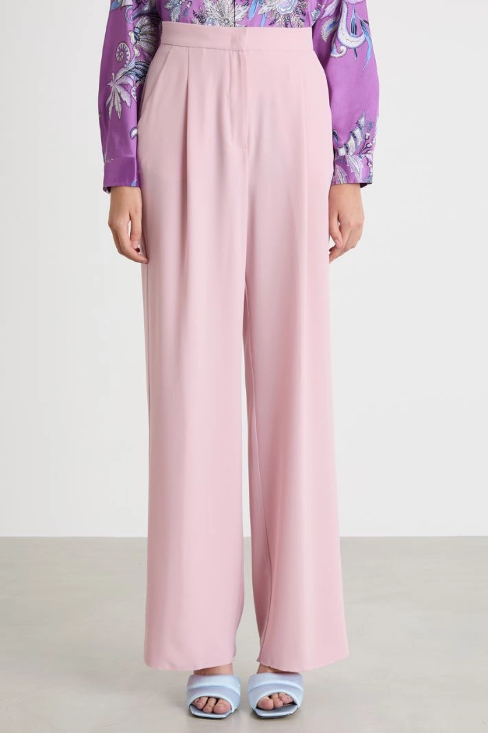 Wide-leg trousers in a fluid fabric, with pleats, pressed creases and French pockets. Hook and zip fastening.