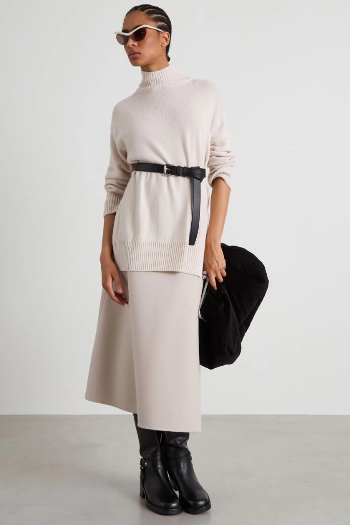 Long, straight-cut, soft sweater in viscose and wool blend, with a high neck, long sleeves with dropped shoulders, side slits at the hem and ribbed edges.