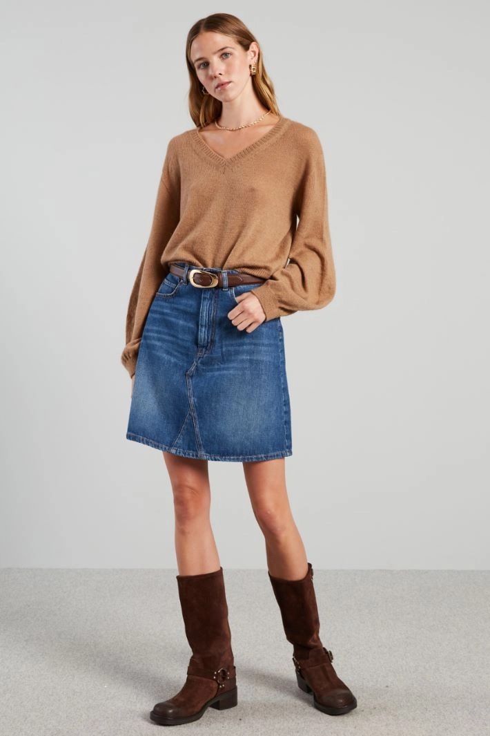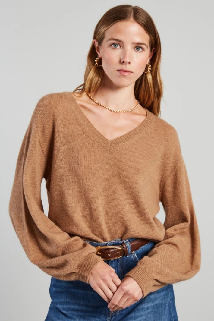 Cropped sweater with a narrow fit at the hem in brushed mohair blend yarn, with V-neck, long balloon sleeves and ribbed profiles.